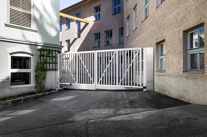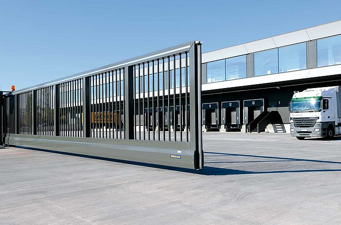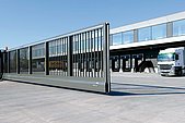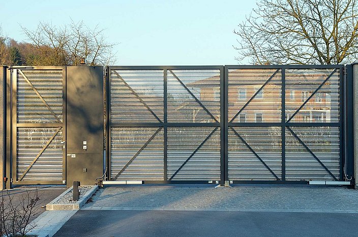 Werkseinfahrten sind wegen ihrer oft extremen Überbreiten eine große Herausforderung. Der patentierte Rollenmechanismus von LIBERO mit freitragendem Laufwerk bietet eine perfekte Lösung hierzu. Torbreiten bis zu 20m sind möglich. Gegenläufige Schiebetore oder Teleskopschiebetore verfügen darüber hinaus über platzsparende Möglichkeiten im Einschubbereich. Verschiedendste Füllungsgestaltung und bequeme Bedienung mit Elektroantrieb sind ein weiterer Bonus.