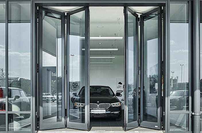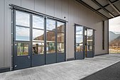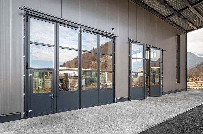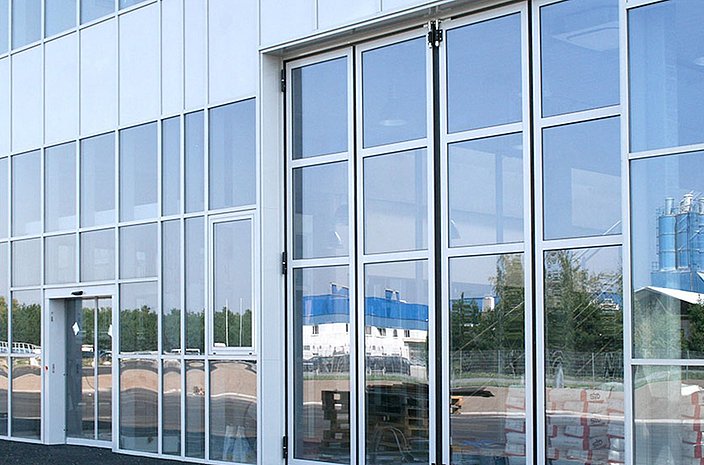 Die einzelnen Rahmenkonstruktionen falten sich ähnlich wie bei einer Ziehharmonika zusammen und geben die Öffnung zum Gebäude frei. Dieses Faltpaket wird zur Seite geschoben und spart so Platz. Thermisch getrennte Rahmen mit entsprechender Isolierverglasung halten den Innenraum warm oder kalt, wie es Ihnen gefällt. Vielseitige Einsatzmöglichkeit ist vorprogrammiert - Autowerkstatt, Landwirtschaft, Lagerhalle und sehr beliebt bei Feuerwehrhallen.